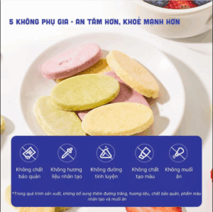 Kết Cấu An Toàn: Bánh giòn rụm nhưng tan chảy tức thì trong miệng bé khi ngậm, giúp bé tập ăn, tập nhai an toàn mà không lo hóc.